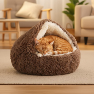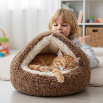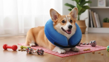 这是一个比较小的小狗窝,帮我生成一张图片。要求是小柯基在使用的场景图,不能出现文字。小狗窝后有小猫趴着观看的场景