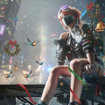 二次元动漫风格插画,整体采用清新的薄荷绿与浅紫色为主色调,搭配柔和的淡蓝色点缀,营造宁静而略带科技感的氛围。画面中央是一位猫耳少女,她有着蓬松的及腰双马尾卷发,发尾微微内扣,发丝柔顺有光泽。少女站立姿态,身体微微侧向左侧,右手自然下垂,左手轻扶腰间的机械装置,双腿并拢,脚尖微微踮起,展现出优雅而警觉的神情。她穿着黑色紧身作战服,外披一件长款薄荷绿风衣,风衣下摆随风飘动,露出黑色过膝长靴。作战服上有银色金属装饰和紫色线条勾勒的科技纹路,肩部和手臂处有机械护甲,腰间配有一把银色手枪,枪身有紫色能量纹路。少女的猫耳竖立,眼神锐利,瞳孔呈淡紫色,戴着黑色耳机,耳机上有绿色指示灯。背景为简洁的浅灰色,突出主体人物,整体构图采用三分法,人物位于画面中央偏右位置,视觉焦点明确,线条流畅,细节丰富,具有强烈的设计感和二次元美学特征。