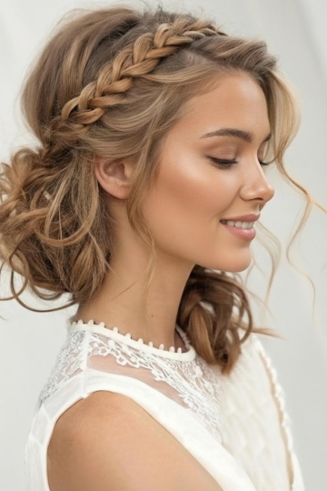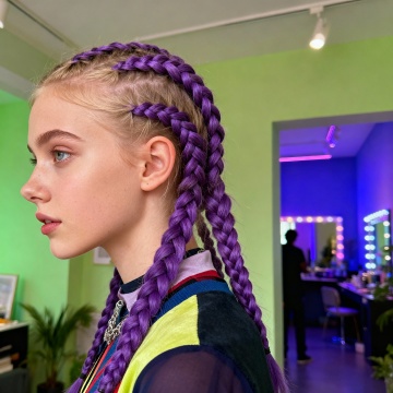 生成一张欧美白人儿童在头上编了紫色的编发,侧面,室内,有衣服