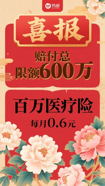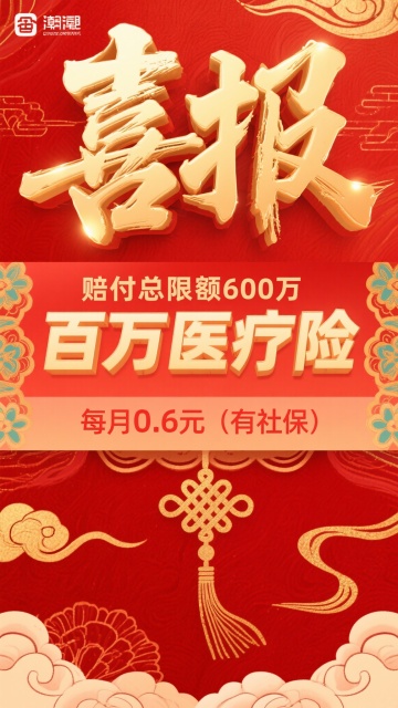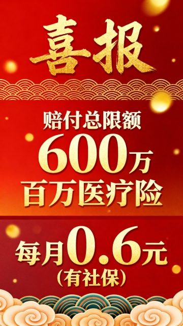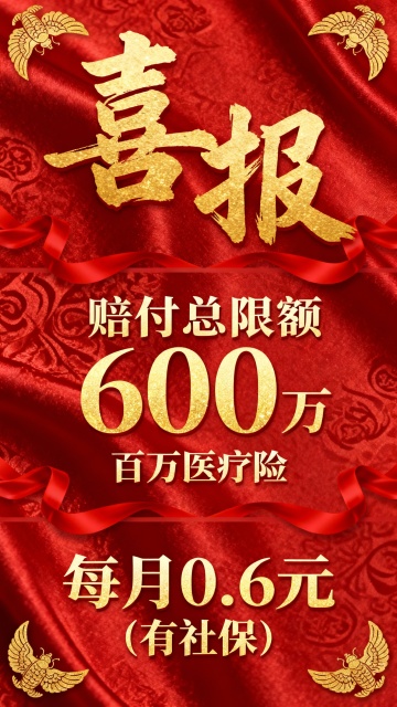 生成十张中国传统节日喜庆风格宣传海报,采用上中下三段式经典版式,最上方用书法大字写着“喜报”,占比约图片1/3,中间文字写着“赔付总限额600万”、“百万医疗险”、下方“每月0.6元(有社保)”,海报整体采用层级化排版,主标题放大醒目,辅助信息有序排列,整体版式平衡稳定,信息传达层次分明,比例 「9:16」