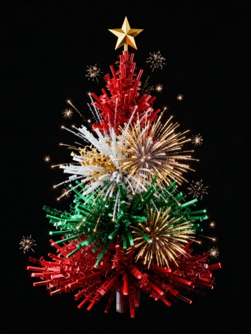 3D糖果圣诞树,重拟物风与波普艺术结合,塑料质感球体堆叠成树形,粒子光效闪耀,喜庆感十足,节日氛围浓厚。