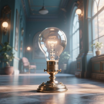 复古鎏金灯座托举发光灯泡,3D重拟物风格,融合欧洲宫廷艺术与金属质感,光影交错间尽显奢华优雅。