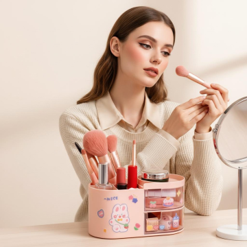 生成一个女孩用的笔盒的图片。笔盒上不要有任何ip的图案,适当的加点可爱图案即可。笔盒闭合着,放在一张淡蓝色桌面上,桌面摆放着一些文具。图片要最高清晰度和分辨率。要当做照片使用。