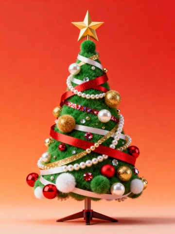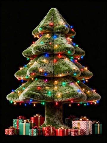 3D毛绒圣诞树搭配鎏金装饰,重拟物风呈现温馨甜蜜感,浮雕边框与毛发生长纹理营造喜庆氛围,节日气息浓郁。