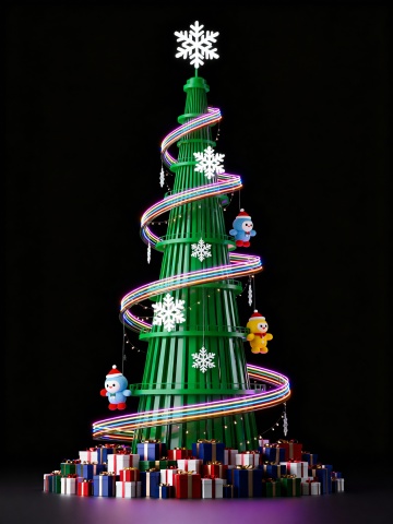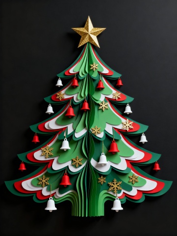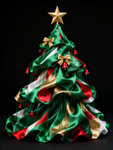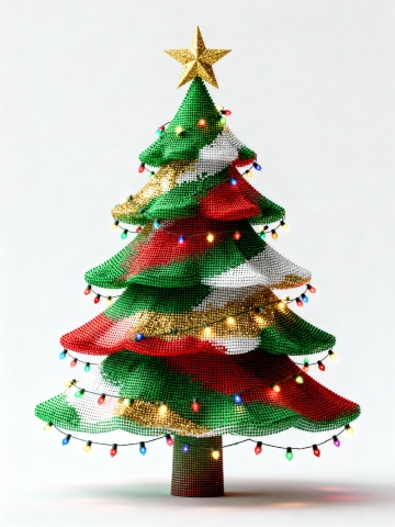 3D风格圣诞树由红绿金三色袜子堆叠而成,融合重拟物与面料质感,点缀金属铃铛与金色星星,营造浓厚喜庆氛围。