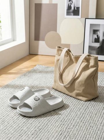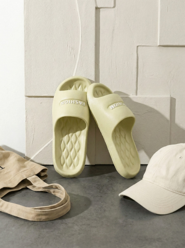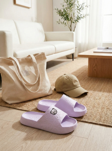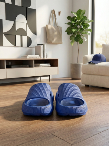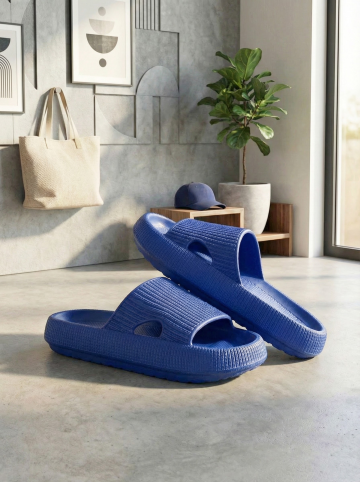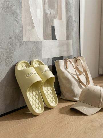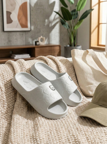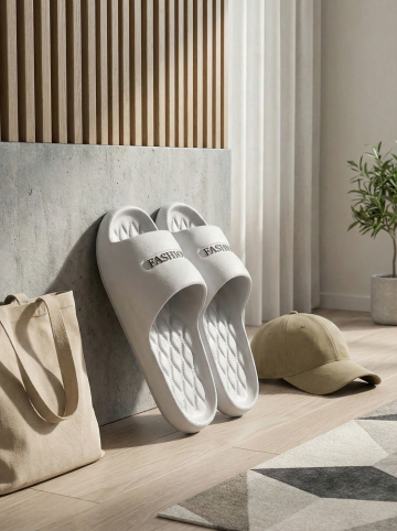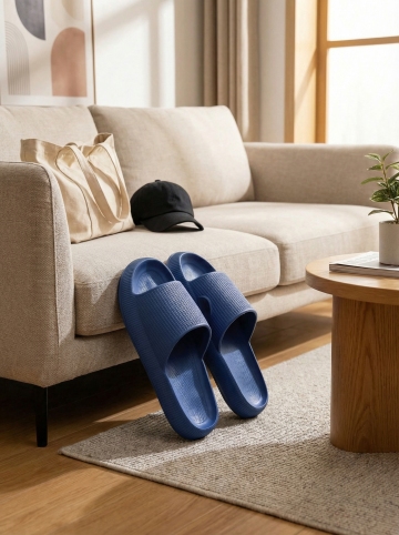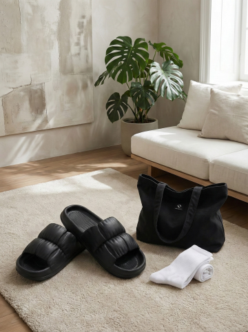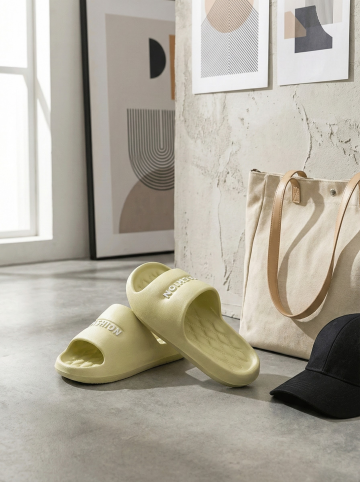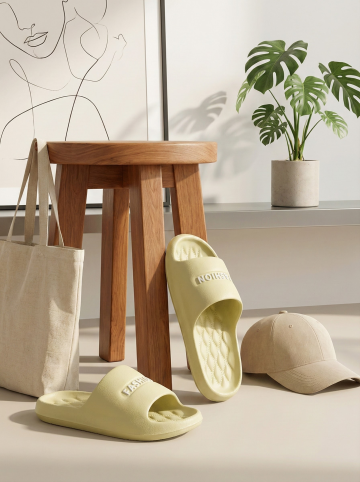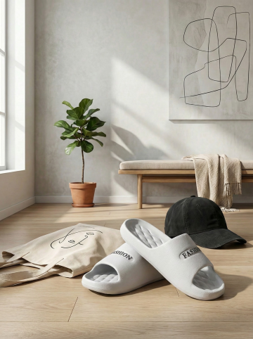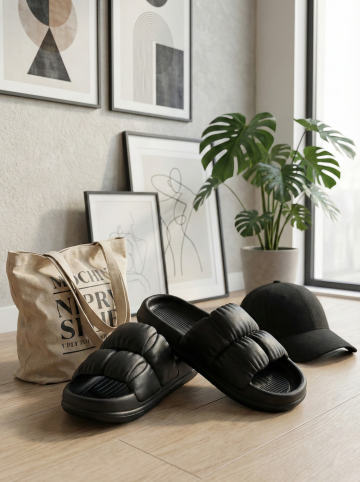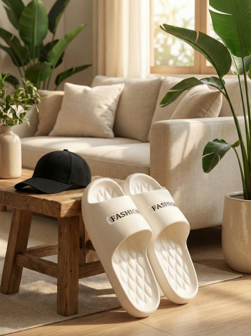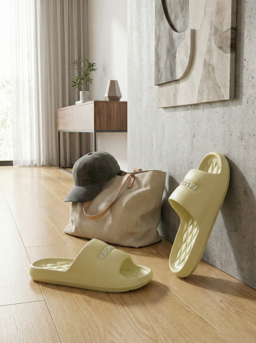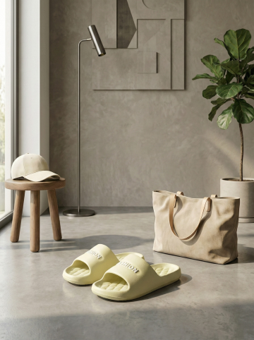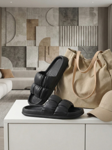 保持原图主体不变,更改背景,一双简约的拖鞋摆放在时尚的室内场景中,背景可能是简约的现代家居或艺术墙,搭配休闲单品如帆布包或鸭舌帽,展现时尚休闲感,图片比例是3:4,分别生成10张拖鞋摆放姿势不同的图片