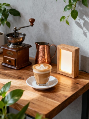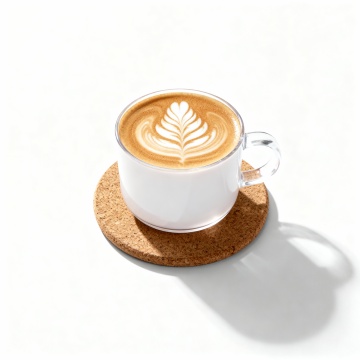 一杯装有精美树叶形状拉花的拿铁咖啡,置于透明玻璃杯中,杯子放在编织纹理的棕色杯垫上,背景改为阳光明媚的户外露台,摆放着简约的木质桌椅,周围有绿色植物点缀,整体保持高清写实风格,柔和的自然光从侧面照射,形成清晰的光影层次和温暖的色调,营造出悠闲惬意的氛围。