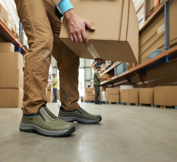 赛博朋克风格的工厂仓库内部,纵深的通道两侧是高耸的红色金属货架,上面整齐堆放着棕色纸箱,地面为灰色环氧地坪并画有黄色警示线,天花板悬挂着长条形冷白光LED灯,通道尽头有白色卷帘门,右侧放置着蓝色的移动登高梯,整体色调以红、黑、灰为主,光线呈现强烈的明暗对比,充满未来工业感,空气中弥漫着科技与机械的冷峻氛围。
