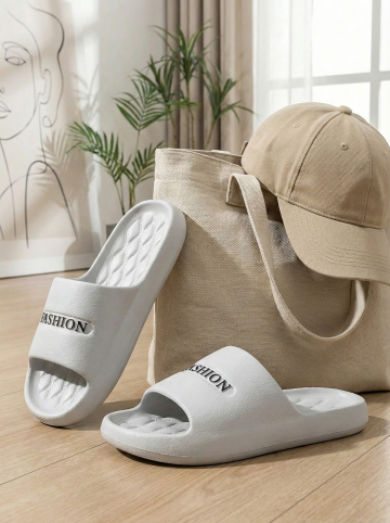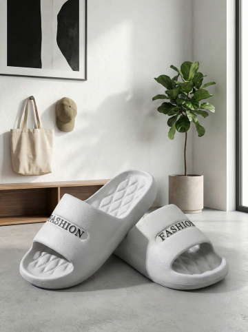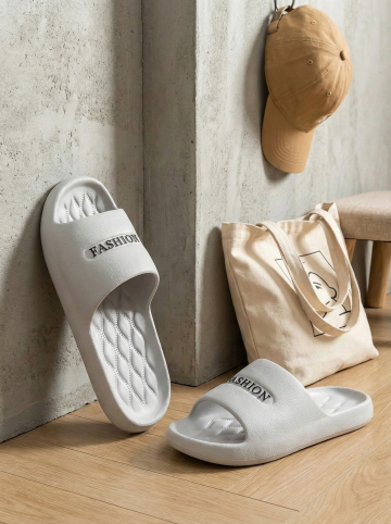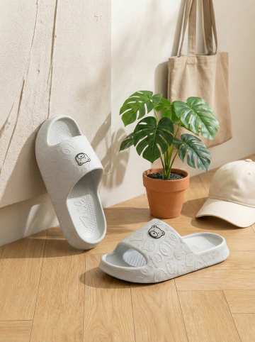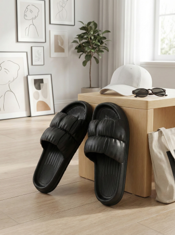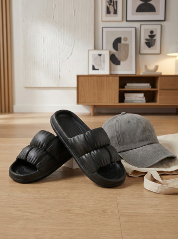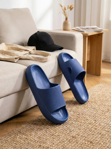 保持原图主体不变,更改背景,一双简约的拖鞋摆放在时尚的室内场景中,背景可能是简约的现代家居或艺术墙,搭配休闲单品如帆布包或鸭舌帽,展现时尚休闲感,图片比例是3:4,分别生成10张拖鞋摆放姿势不同的图片