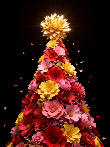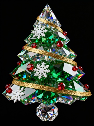几何风玻璃圣诞树,融合红绿金三色晶透切面,3D立体结构闪耀奢华感,重拟物设计呈现清透质感与喜庆氛围,顶部星饰点亮节日光芒。