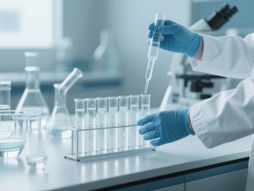 俯视角构图,极简主义实验室工作台面中央,一只戴着无菌白色丁腈手套的手正以毫米级精度操控着一支尖端极细的石英微量移液器,透明的液体弯月面在吸头末端形成完美的半球体,正悬停在一支刻有金色刻度线的硼硅酸盐玻璃试管正上方2毫米处,试管内装有三分之二体积的淡蓝色荧光溶液,底部沉淀着细密如星尘的白色颗粒,周围环绕着五只排列成正六边形的相同试管,每只试管内液体呈现出从浅蓝到靛蓝的渐变层次,背景是被柔和白光均匀照亮的浅灰色环氧树脂台面,左侧放置着一个带有蓝色LED指示灯的小型离心机,右侧是半开的磨砂玻璃试剂瓶,整个画面采用高对比度的蓝白灰三色系统,8K超高清分辨率捕捉到手套纹理和液体表面张力的微妙变化,浅景深使所有元素聚焦于移液动作的黄金分割点,营造出冷静、精准、近乎仪式感的科学美学。