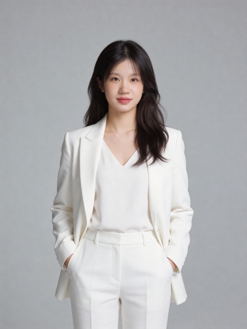 大气白色西装黑色内搭插兜女士形象照