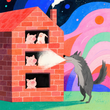 * 大灰狼来到砖房前,它用力吹了好几口气,但砖房纹丝不动。