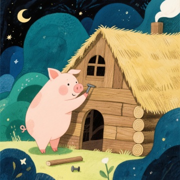 * **第二只小猪**稍微勤劳一些,它用木头建房子。虽然比稻草屋费时,但它还是很快完成了,然后也开始享受生活。