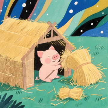 * **第一只小猪**很懒惰,它决定用稻草建房子,因为这样最快。不久,它就建好了一座稻草屋,然后开始享受悠闲的生活。