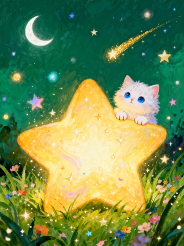 鎏金风插画,梦幻光影交织,猫咪沐浴星辉,神圣唯美感十足,厚涂技法勾勒虚拟自然,油画质感尽显宇宙诗意。