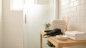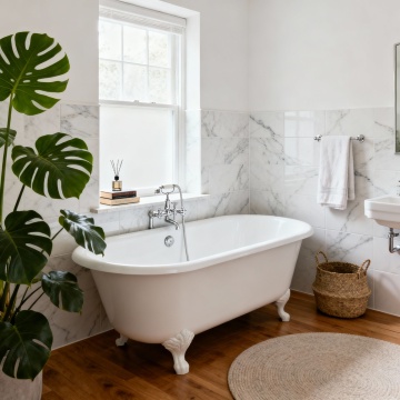 极简主义风格浴室,整体以纯净的白色为主色调,搭配温暖的原木色人字拼地板,营造出明亮、洁净、宁静的氛围。柔和的自然光从画面外洒入,在白色墙面上形成微妙的光影过渡,光线均匀柔和,阴影细节自然。空间布局改为开放式淋浴区与独立式浴缸分区设计,浴缸更换为带有金属支架的椭圆形亚克力材质,置于房间中央位置,旁边增设一个原木色置物架。墙面采用大块哑光瓷砖铺设,局部嵌入浅灰色石质壁龛用于收纳洗漱用品。悬挂式白色洗手台下方设计成开放式储物格,搭配黑色金属水龙头和圆形镜子。天花板安装两盏黑色半球形吊灯,提供主要照明。浴室内摆放简约线条的原木色收纳柜和绿植装饰,毛巾和洗漱用品保持整齐摆放,整体视觉层次分明,信息传达简洁高效,符合现代都市人群对简约生活美学的追求。