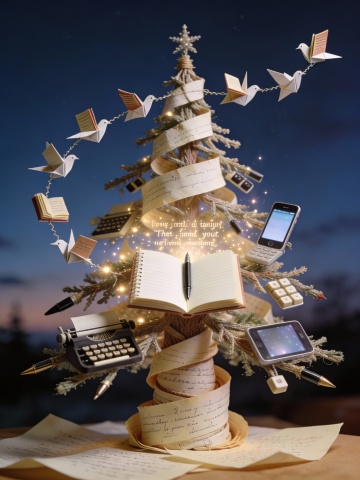 以时间为概念核心的创意圣诞树主视觉画面,材料并非具体物品,而是时间的视觉化表达。整棵圣诞树由年轮切片、钟表零件、日历纸页、时间刻度线、时间轴与抽象计时符号逐层构成,整体呈稳定但不完全对称的三角结构,具有设计感与叙事性。圣诞树从下至上呈现清晰的层级变化:底部以粗糙、厚重的年轮与旧纸质日历为主,质感偏真实与时间沉积感;中段由钟表齿轮、刻度线与半抽象结构组成,精致而有秩序;顶部逐渐转为极简与抽象,仅保留时间线条与光感,象征时间的凝练与流逝。树顶不是传统星星,而是以数字“00:00”或抽象时间刻度符号呈现,作为时间重启与新起点的象征,比例克制,位置明确。圣诞树周围有极简光线或细微发光轨迹,如时间被点亮的瞬间,光效克制、不喧宾夺主。