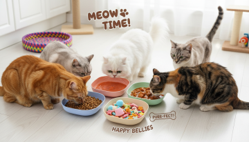 以图中的猫粮碗为元素,猫咪在吃饭,物体主体特征不变,设计6张跟猫粮碗有关的图,可以适当加一些英语文案点缀,,比例 「16:9」