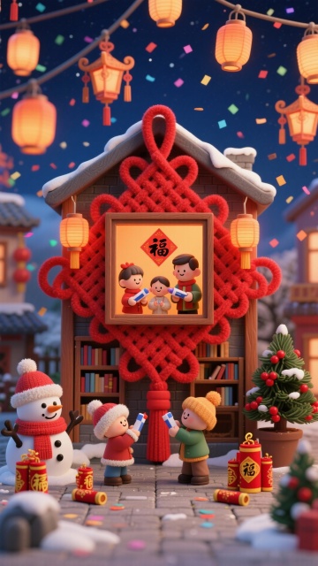软3D风格插画,融合国潮元素与卡通感,雪夜烟花绽放,红灯笼高挂,孩童嬉戏屋檐,温馨喜庆的春节氛围扑面而来。
