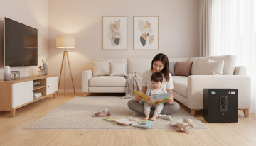 现代温馨家庭场景,一位25岁的孕妇坐在客厅地毯上看书,身穿米色长袖,双手拿着展开的书籍近距离看,眼睛视线对齐书籍,亚洲女性。旁边儿童在地上玩耍,大落地窗连接城市远景。屋内光线柔和,空气中弥漫着淡淡的蜜糖水甜味,营造出宁静、温馨、充满爱意的氛围