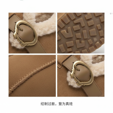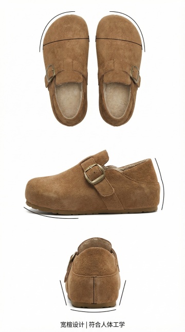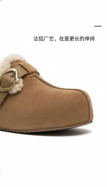 视觉: 左右分屏或上下分屏对比。左/上:牛反绒微距纹理,配以棉麻、纸张等天然材质。右/下:羊羔绒内里特写,配以羊毛、云朵等柔软意象。 文案: 「外,坚韧而温润 | 内,包裹以云柔」,并附简短说明:头层牛皮反绒 / 加厚亲肤羊羔绒。