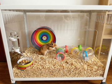 让仓鼠笼的颜色变成鲜亮的白色,毛绒变平顺,整体变新,商业拍摄氛围,不能改变仓鼠笼的大小