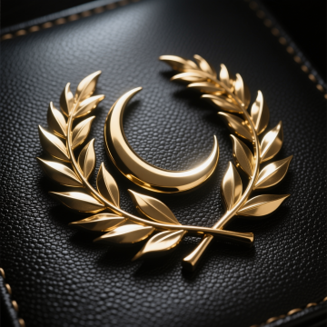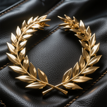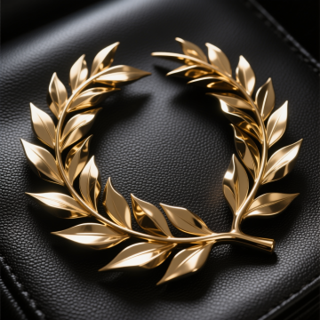 一个精致的金色月桂花环,由多片对称排列的叶子组成,叶子呈现出光滑的金属质感,边缘有细腻的高光,整体造型优雅庄重,适合作为荣誉或成就的象征标志。