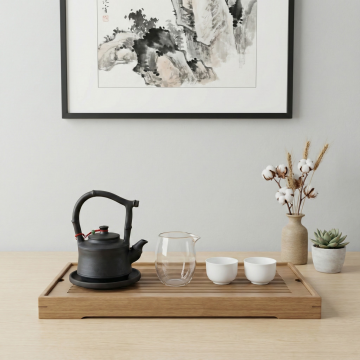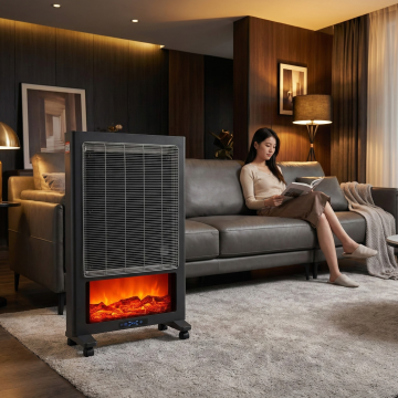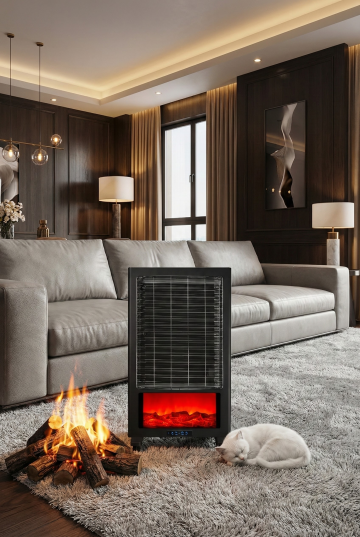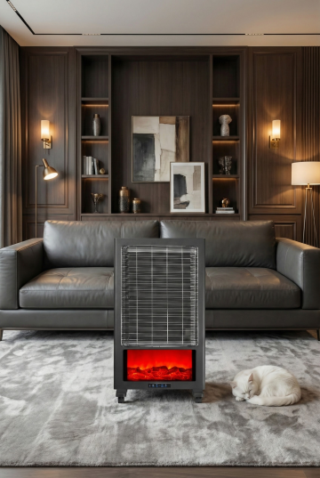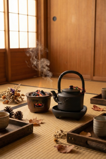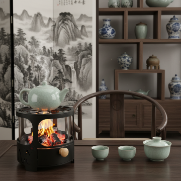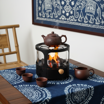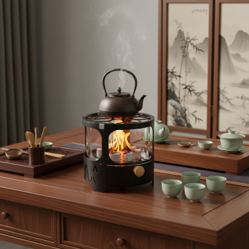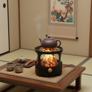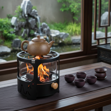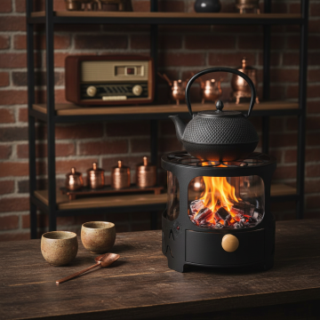炉子本体不能被改动,背景是喝茶,炉子在大的深色茶桌上面,炉子边上放几个茶杯,炉子里面有一些木碳在燃烧(有明细的火焰),炉子上有一个茶壶在烧着,设计10张不一样的图
