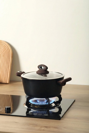 工业风户外灶具,金属质感搭配橙色点缀,科技感火焰显示与光影交织,展现现代机能美学与质朴野营场景的融合。