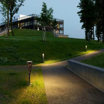 构图:壁灯呈水平等距排列,形成视觉引导线;下方绿植与步道构成前景,上方建筑为背景,层次分明,空间感强;
