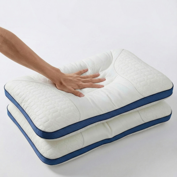 场景为简约浅蓝色背景的展示空间,无多余杂物。一位中国女性侧睡在参考图的枕头上,构图采用产品与人体睡姿结合的近景布局,突出参考图的枕头使用体验。色彩风格清新柔和,以浅蓝、白色为主背景,营造出舒适健康的产品展示氛围。