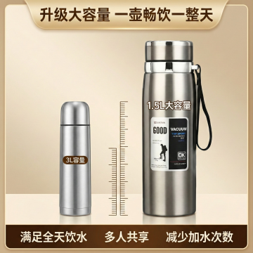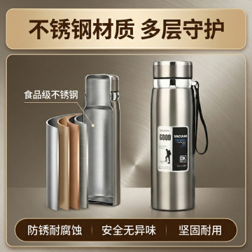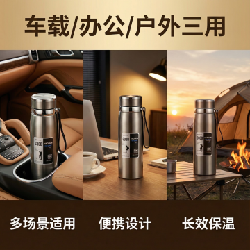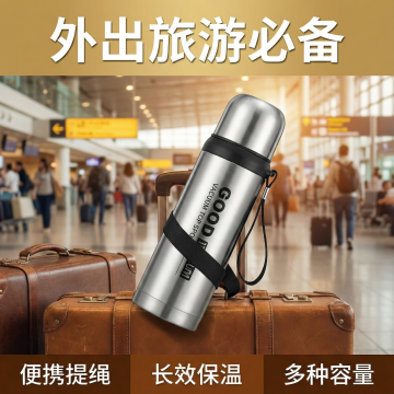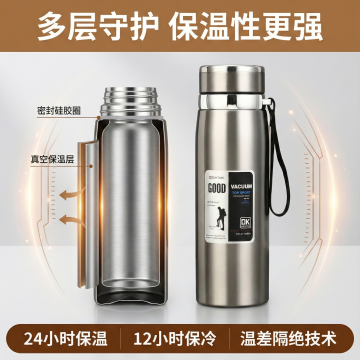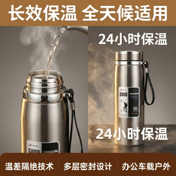这张图片是产品主体这款产品是真空吊带壶 我需要设计20张主图在拼多多上面售卖 等背景元素 整体色调暖色,显得高级一些 主图文案内容 长效保温保冷 多种容量 不锈钢材质 圆润杯口 喝水更舒适 旋拧顺畅无阻 便携提绳 方便携带 全身可水洗 简约不简单 商务办公 运动休闲 外出旅游 专注品质 多层守护 保温性更强 升级大容量 一壶畅饮一整天 长效保温 全天候适用 温差隔绝 车载 / 办公 / 户外三用