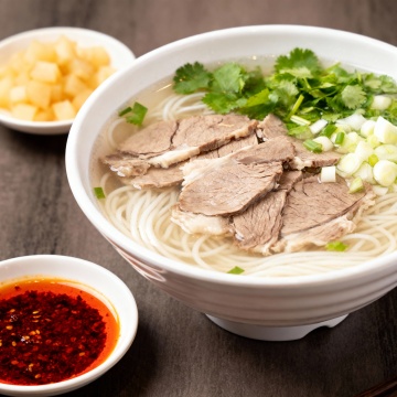 顶视角度,一碗黑色的碗里装着飘香的牛肉面,面条根根分明,汤色浓郁,上面撒着鲜红的辣椒和翠绿的葱花,热气腾腾,散发着诱人的香气,画面清晰,色彩鲜艳,细节丰富