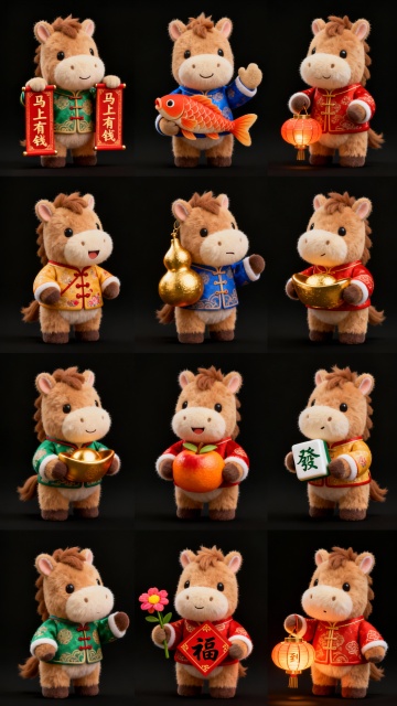 软3D卡通小马搭配刺绣风“招财进宝”牌匾,毛发生长质感与浮雕云纹背景交织,国潮风浓郁,喜庆可爱,金元宝与福字点缀,节日氛围满溢。