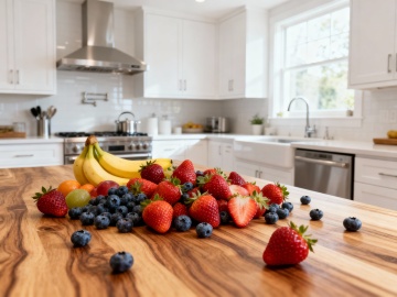 清新草莓与苹果,简约木质托盘,柔和自然光,营造温馨日常氛围。