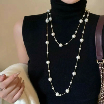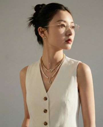 半身构图,亚洲年轻女性微微侧身45度,左手无名指轻触锁骨处珍珠项链的坠子,右手自然垂落于身侧,浅棕色中长发在柔和光线下呈现出蜜糖般的层次感,几缕发丝随动作轻轻拂过纤细的脖颈。自然妆容强调通透质感,浅棕色眉毛如自然生长般柔和,内眼线仅在眼尾处微微上扬,淡粉色眼影如晨雾般晕染眼窝,珊瑚色唇膏中央点缀着一丝透明唇蜜,光泽感底妆在偏侧光下展现出细腻的皮肤纹理。简约的金色几何耳坠随着头部微倾的弧度轻轻晃动,白色丝质吊带裙的肩带在肩胛骨处形成优雅的V形线条,背景是带有微妙纹理的奶油白,光线从左上方45度角温柔洒落,在颈部和锁骨处形成渐变的柔光过渡,整体氛围如同被时光定格的静谧午后,极简主义构图中蕴含着含蓄的优雅张力。