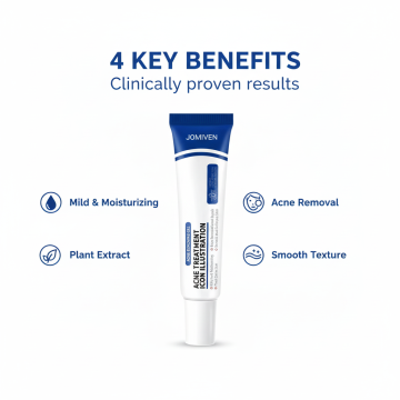 美妆产品宣传海报,整体采用清新通透的蓝白渐变色调,柔和的顶部光源营造出水润光泽感,3D立体展示的白色软管状护肤品置于圆形白色平台上,周围点缀白色花朵和绿色叶片,画面上方有产品核心功效的蓝色圆形图标与文字说明,中部包含分点介绍的肌肤问题示意图与解决方案,下方通过水滴、透明气泡等元素展现产品水润质地,搭配清晰易读的无衬线字体,整体排版层次分明,信息传达高效,符合护肤品针对敏感肌、追求温和清洁与保湿人群的宣传目的,保持相同设计风格与视觉元素,替换展示不同护肤品。