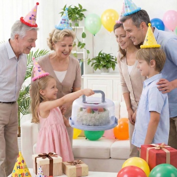 帮我生成一张美国家庭在过生日的场景图,图中小女孩正想拿起蛋糕盒,要求装蛋糕的盒子形状不要改变