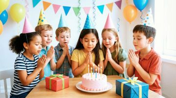 喜庆感十足的儿童生日派对,卡通风格与实景结合,轻拟物风装饰搭配拼贴元素,梦幻清新,充满欢乐氛围。