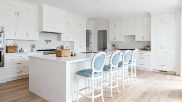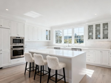 一个明亮整洁的现代厨房,采用简约优雅的设计风格,以白色为主色调,搭配黄铜色金属装饰细节。厨房整体呈现出温馨舒适的氛围,阳光透过百叶窗洒入,在白色橱柜和大理石台面上形成柔和的光影效果。白色的橱柜带有黄铜色的圆形拉手,上方的吊柜和下方的地柜组合提供了充足的储物空间。大理石台面光滑洁净,带有自然的灰色纹理。台面上有一个双槽不锈钢水槽,搭配黄铜色的水龙头。水槽旁边的金属桶里插着木质的锅铲和汤勺。墙面安装着黄铜色的挂杆,上面挂着各种木质和金属材质的厨房用具,包括勺子、铲子等。挂杆上方的白色搁板上摆放着不锈钢和玻璃材质的储物罐,里面装着各种香料和食材。台面上还摆放着一个白色的盘子,里面放着几块叠在一起的三明治,旁边还有一盘色彩鲜艳的沙拉。整体构图采用了三分法,光线从左侧窗户进入,营造出明亮通透的感觉,细节丰富,质感细腻,展现出干净利落的现代厨房设计感。