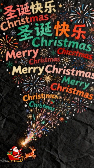 主体:左下角一个微缩的圣诞老人骑着驯鹿雪橇,手拿着点燃的礼花,礼花喷出的烟花自上而下落下密集的各色的圣诞快乐、Merry Christmas几个字,成烟火状,几乎铺满整个画面。 装饰元素:其余部分留白 色调:圣诞色调 背景:黑色肯特纸 风格:手绘风格