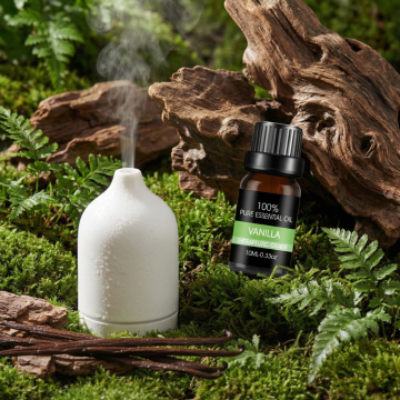 将图1中的精油瓶替换为图2的椰子精油瓶,并将乳香原料替换为叶子和切开的椰子,生成后的图片要保持图1的自然氛围和光影效果。
