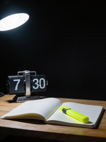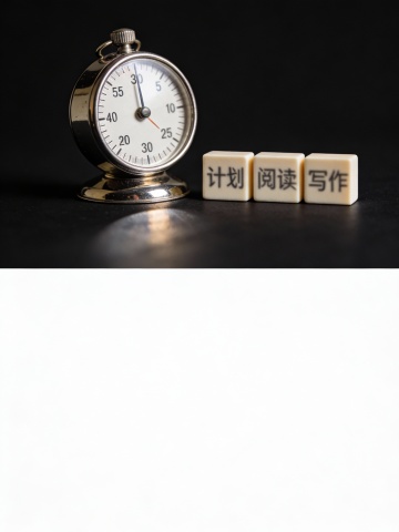 图片整体为黑底,在上部约三分之一处的左边有一个设为30分钟的老式厨房计时器,旁边三个方块标有可读的文字(如“计划”“阅读”“写作”)。焦点在计时器金属反光上,图片下部大片留黑。风格介于产品摄影与教育极简之间。