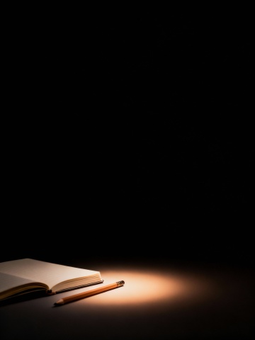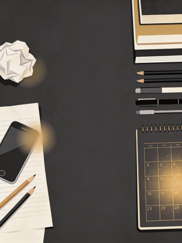 一个正在写字/整理文件的人,桌子上有笔记本、文件夹,传达“梳理信息、准备素材”。