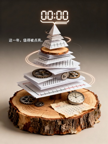 本作品以时间作为材料,将年轮、日历、刻度线与钟表结构等时间符号,层层叠加为一棵向上生长的圣诞树。底部的年轮与旧日历象征时间的重量与积累;中段的刻度与机械结构代表秩序、流动与持续;顶部的时间符号“00:00”指向一个结束,也指向一个全新的起点。在这里,圣诞不再只是节日装饰,而成为时间被看见、被确认的瞬间。当指针归零,光亮升起,这一年被完整走过,也值得被点亮。