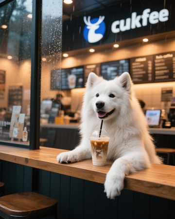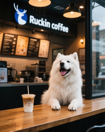 一只表情愉悦的萨摩,坐在瑞幸咖啡店内的木质柜台上,一只爪子托着下巴,面前放着一杯带有吸管的瑞幸咖啡冰拿铁,背景可见瑞幸咖啡的标志和菜单板,暖色调灯光,玻璃窗上有雨滴,写实摄影,高细节,4K分辨率,--ar 4:5,萨摩长相参考上传的图片,生成6张,不同动作
