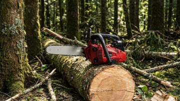 高清真实摄影风格,红色PTS油锯(3/8"链条、黑色手柄、机身印有PTS标识)放置于树桩上,旁边是被砍伐的原木(树皮纹理清晰、断面年轮分明),背景为绿色草地与浅色泥土,自然光下机械细节与木材纹理清晰可见,商业宣传图质感