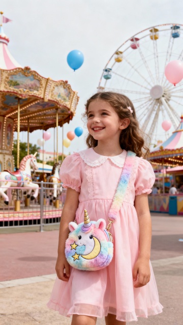 一个外国穿着粉色可爱连衣裙的小女孩手里提着图片中产品的包包,包包样式款工纹理都不变,包包缩小点,背景是生日派对,小女孩面带微笑,远景,