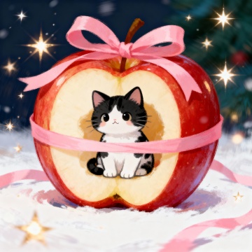 插画风水彩绘,拟人小猫藏于苹果中,粉红丝带缠绕,雪夜星光闪烁,梦幻温馨可爱,节日氛围浓厚。